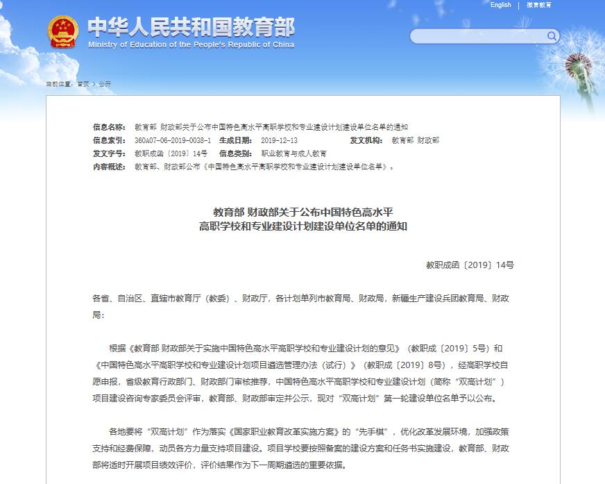 喜讯 | 我院入选中国特色高水平高职学校建设单位