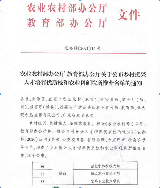 此次推介的乡村振兴人才培养优质校,按照“广泛推荐、优中选优、引领示范”的原则遴选,经院校自荐、省级推荐、专家交叉评审、社会公示等环节产生,最终在全国众多申报单位中优先评选了101所优质校和农业科研院所,陕西省3所学校入选,伟德官网位列其中。