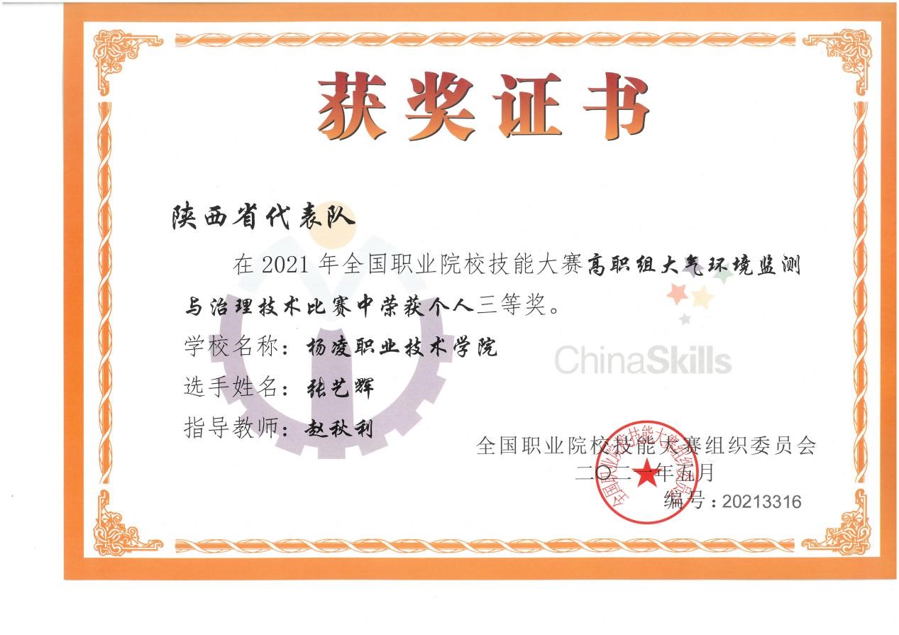 6月25日至27日,2021年全国职业院校技能大赛高职组“大气环境监测与治理技术”赛项在河北工业职业技术大学举办,来自全国各地26支代表队参赛,伟德官网赵秋利老师指导的2019级环境监测与控制技术专业学生张艺辉参赛,荣获大赛三等奖。