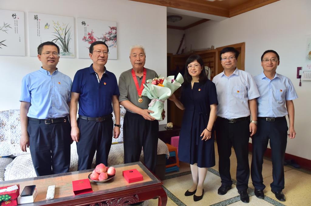 校领导一行来到吉殿威、刘修身、李安杰老党员家中,亲切与老党员们拉家常,关心询问老人的身体健康与生活起居等情况,叮嘱他们照顾好身体,一起回顾他们在党50年的光辉历程,聆听老党员在教书育人、学校建设历史中的奋斗故事,感谢他们始终忠于党的事业、践行党的宗旨、履行党员义务,默默为党和国家的事业做出贡献,并为老党员佩戴“光荣在党50年”纪念章,送上鲜花和慰问品。座谈中李安杰老师还动情地为大家朗诵了一首自己创作的诗词《水调歌头·七一》有感,表达对党的无限忠诚。