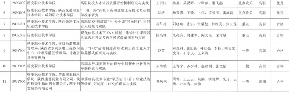 其中,王云江教授主持的《高职院校人才培养质量评价机制研究与实践》和刘洁教授主持的《“一带一路”背景下高职建筑工程技术专业教学改革研究》在2019年度陕西高等教育教学改革研究项目结题验收中获“优秀”等次,杨红梅等5人主持项目获“合格”等次。
