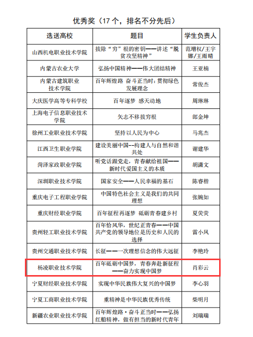 近日,教育部高校思政课教学指导委员会公布第五届全国高校大学生讲思政课公开课展示活动获奖名单。伟德官网选送作品《百年砥砺中国梦,青春奔赴新征程——奋力实现中国梦》(学生负责人:肖彩云,指导老师:刘晓瑞)获优秀奖,为全省唯一获奖高职院校。