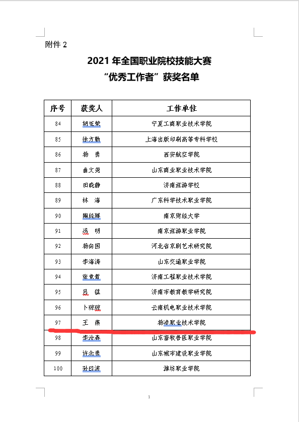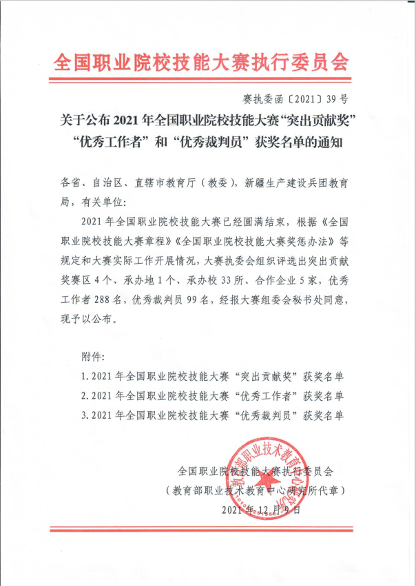 近日,全国职业院校技能大赛执行委员会公布了2021年全国职业院校技能大赛“突出贡献奖”、“优秀工作者”和“优秀裁判员”获奖名单,伟德官网荣获“突出贡献奖”,生物工程学院副院长王燕被评为“优秀工作者”。