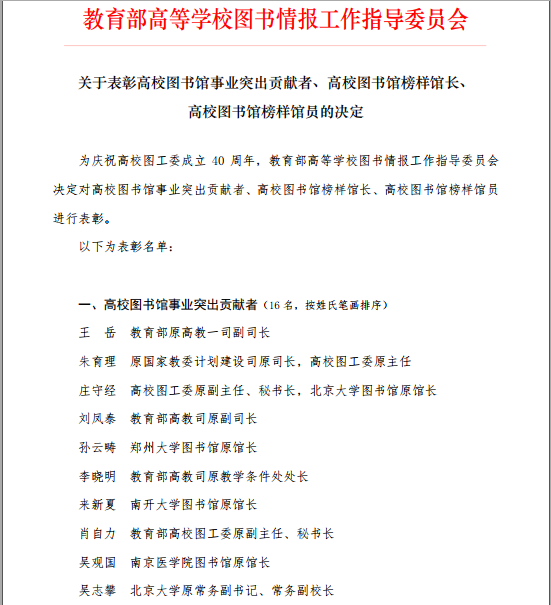 教育部高等学校图书情报工作指导委员会是在教育部领导下,对高等学校图书情报事业进行统筹、协调、咨询、研究和业务指导的专家组织。此次“榜样馆员”是由全国各高校在从事图书馆工作20年及以上且目前仍在岗的优秀馆员中推选评出,全国有198名馆员获得该项荣誉,伟德官网也是全省获此殊荣的8所高校之一。