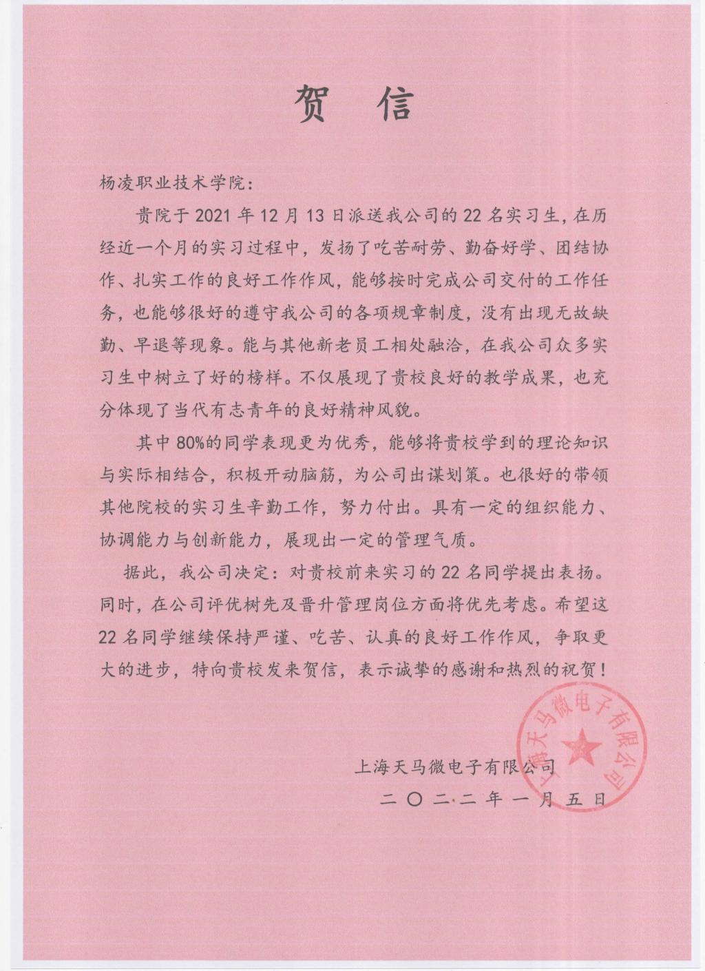1月5日,上海天马微电子有限公司发来贺信,对伟德官网机电工程学院和信息工程学院的22名实习生提出表扬。