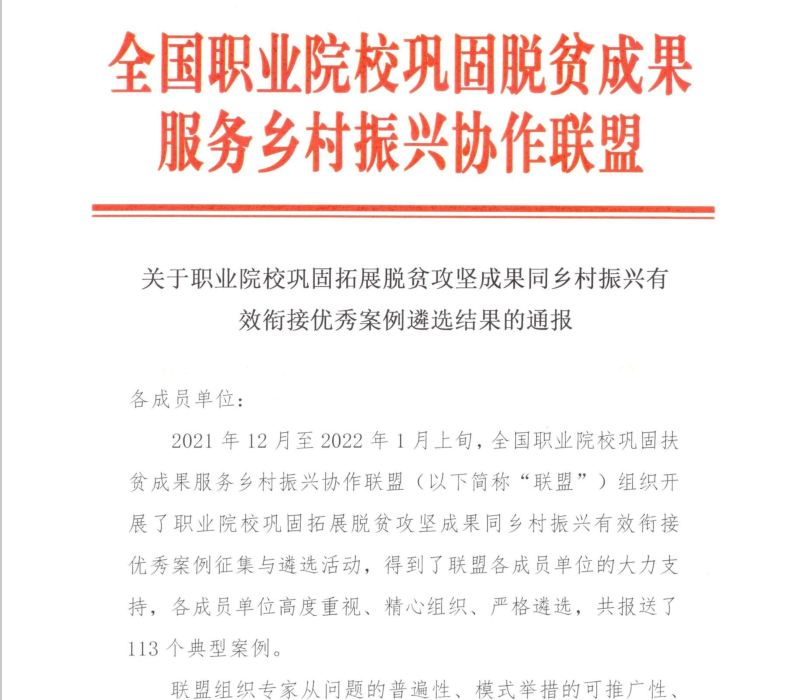 据悉,此次教育部职成司组织开展案例征集与遴选活动,旨在总结职业院校在巩固拓展脱贫攻坚成果同乡村振兴有效衔接的有益经验和有效做法,宣传推介职业院校实践成果,为下阶段工作提供示范经验,并通过联盟公众号、联盟网站、相关媒体等推广宣传。