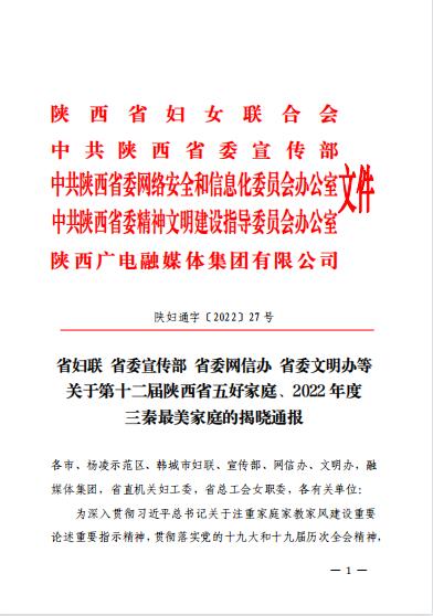 近日,陕西省妇联、省委宣传部、省委网信办、省委文明办等单位联合发文,对第十二届陕西省五好家庭、2022年度三秦最美家庭进行表彰,伟德官网高睿家庭榜上有名,获评陕西省2022年度三秦最美家庭。