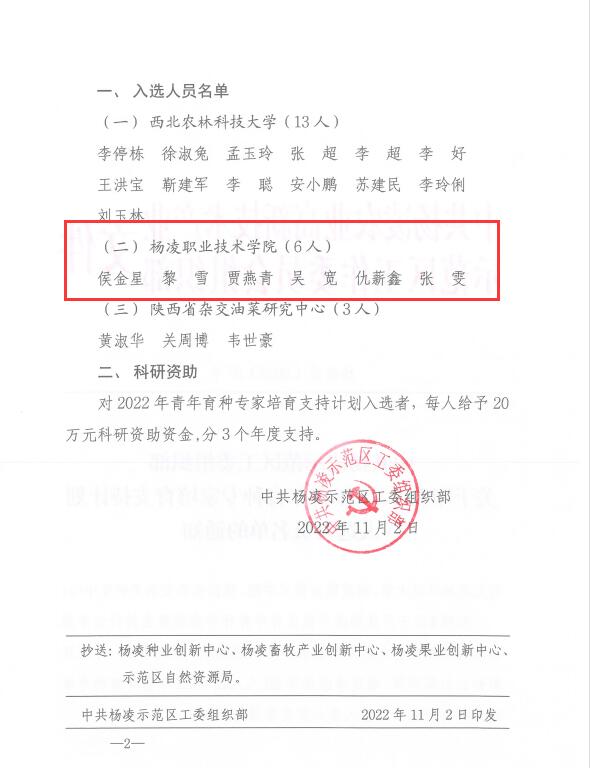 11月3日,杨凌示范区召开青年育种专家座谈会,宣布2022年青年育种专家培育支持计划入选名单,伟德官网侯金星、贾燕青、黎雪、仇薪鑫、吴宽、张雯等6人入选2022年青年育种专家培育支持计划。副校长胡俊鹏出席座谈会,张雯、侯金星代表入选人员做表态发言。
