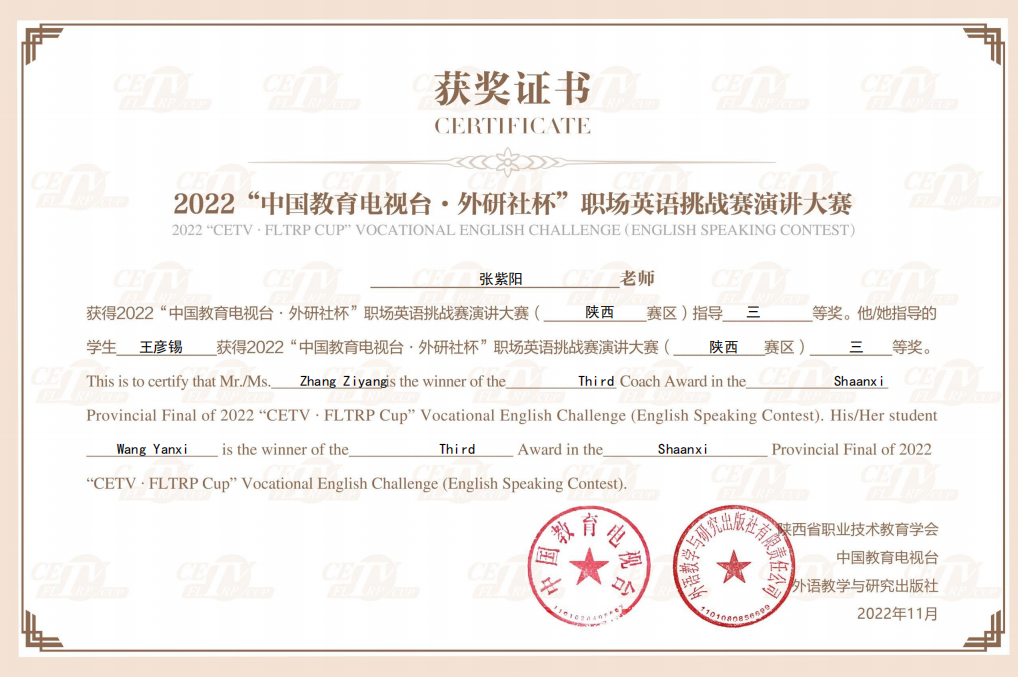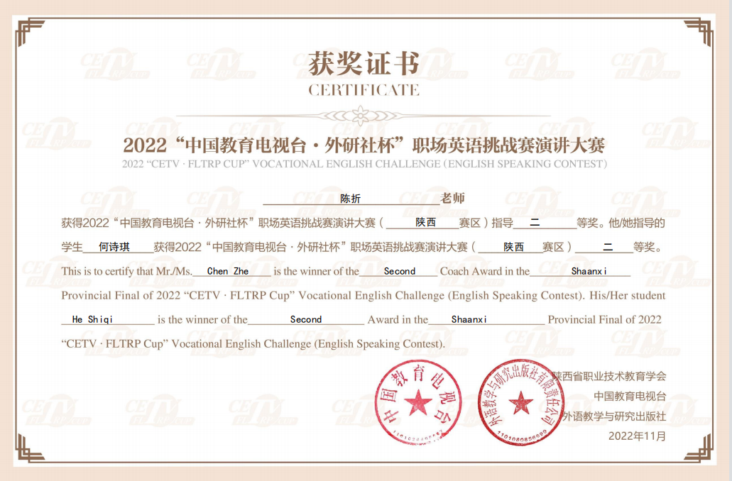 本次比赛在中国职业技术教育学会指导下,由陕西省职业技术教育学会、中国教育电视台和外语教学与研究出版社联合主办,全省近200名学生参赛,是一项拥有地区影响力的职业教育类赛事,分演讲大赛和写作大赛两大赛事。今年省赛与国赛首次采用不分组的方式,即英语专业和非英语专业的学生使用同样的赛题进行角逐,给非英语专业的学生带来了很大的挑战。