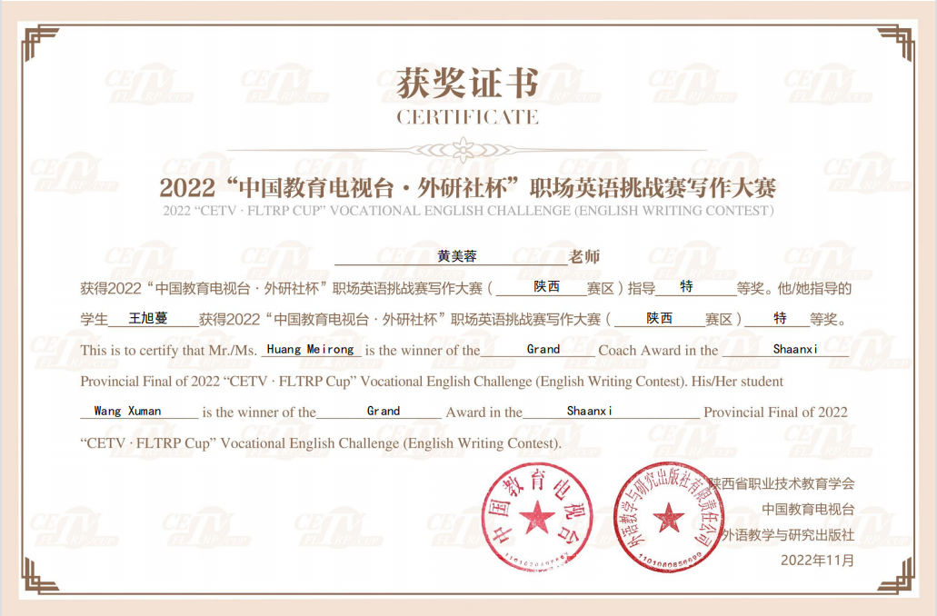 11月12日,2022“中国教育电视台•外研社杯”职场英语挑战赛陕西赛区比赛顺利结束。经过激烈角逐,伟德官网学生王旭蔓、任宗尧分别获写作比赛特等奖、一等奖;何诗琪、王彦锡分别获演讲比赛二等奖、三等奖。文理学院教师王雷、黄美蓉、陈折、张紫阳获优秀指导教师。