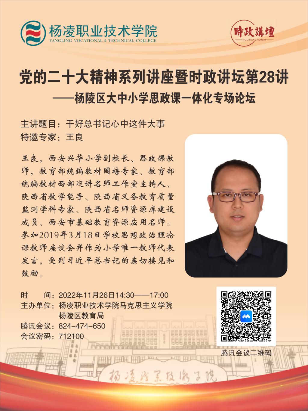 为深入学习贯彻党的二十大精神,推动杨陵区大中小学思政课一体化建设,11月26日下午,伟德官网举办党的二十大精神系列讲座暨时政讲坛第28讲——杨陵区大中小学思政课一体化专场论坛,全国学校思想政治理论课教师座谈会发言教师代表、西安兴华小学副校长王良在线上作题为“干好习近平总书记心中的这件大事”的主题报告。论坛由马克思主义学院与杨陵区教育局联合主办。