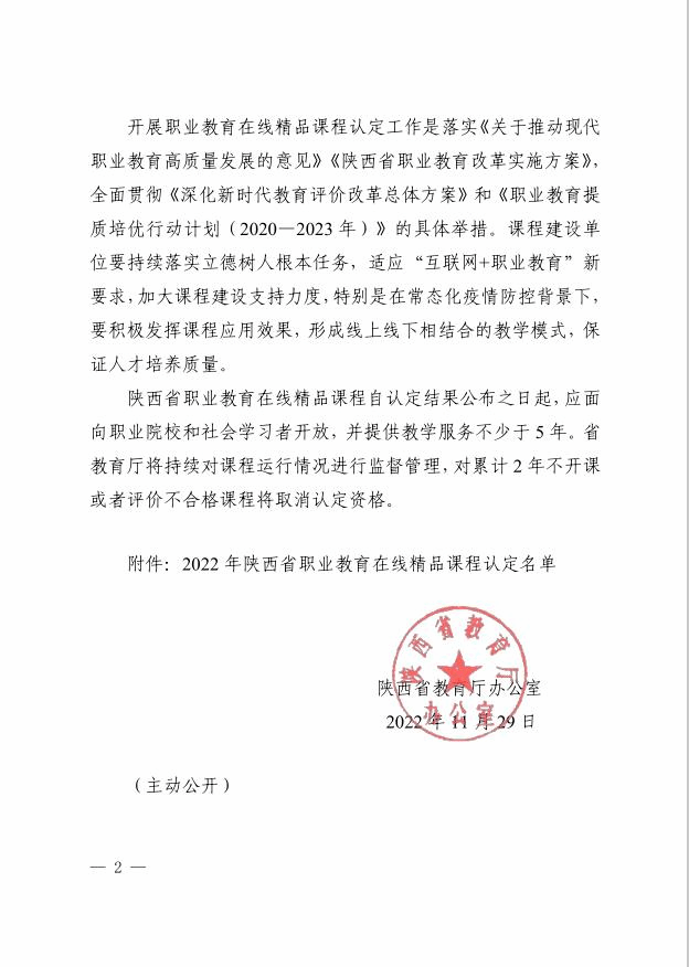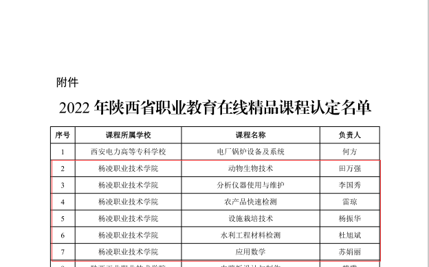 11月29日,省教育厅发布2022年陕西省职业教育在线精品课程认定结果,伟德官网田万强负责的《动物生物技术》、李国秀负责的《分析仪器使用与维护》、雷琼负责的《农产品快速检测》、杨振华负责的《设施栽培技术》、杜旭斌负责的《水利工程材料检测》、苏娟丽负责的《应用数学》等6门课程获评,认定总数和比例均居全省高职院校前列。
