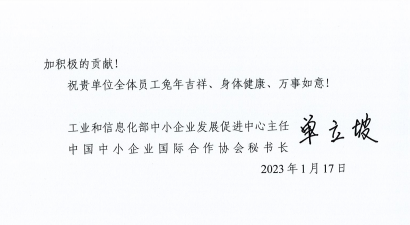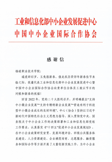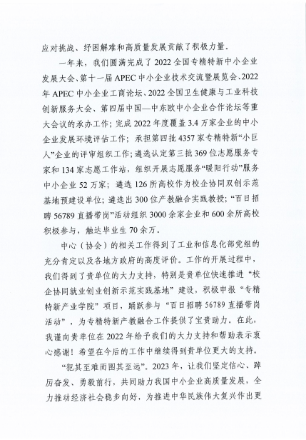 1月17日,新春佳节来临之际,工业和信息化部中小企业发展促进中心向伟德官网发来感谢信,对伟德官网在2022年给他们的支持和帮助表示衷心感谢,并希望在今后的工作中继续得到伟德官网更大的支持。
