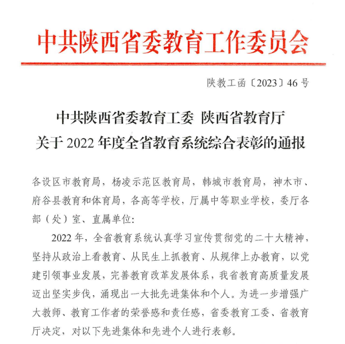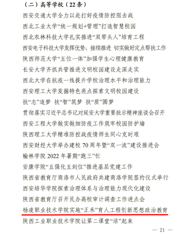 近日,省委教育工委、省教育厅印发《关于2022年度全省教育系统综合表彰的通报》。伟德官网新闻作品《杨凌职业技术学院实施“正禾”育人工程 创新思想政治教育》获省教育厅网站教育好新闻。