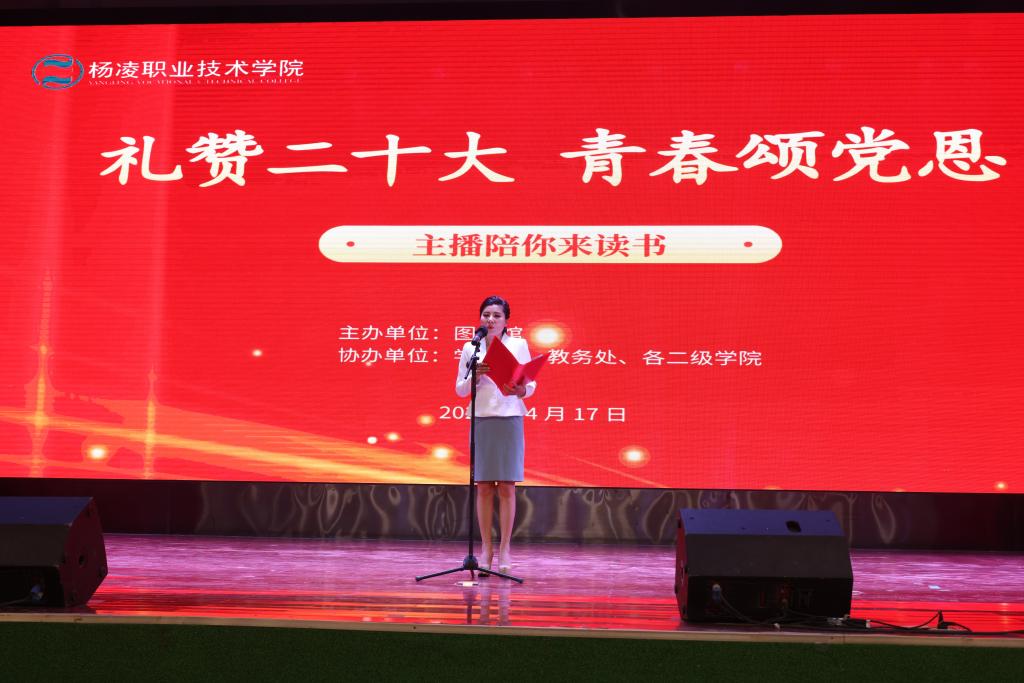 4月17日下午,伟德官网“4·23世界读书日”系列活动启动仪式暨“礼赞二十大 青春颂党恩”主播陪你来读书朗诵活动在南校区一卡通中心举行。副校长祝战斌,超星集团西安分公司行政人事部总经理马云志,西安广播电视台主任记者张曦元,杨凌农科传媒集团通联部主任李慧,以及学生处、教务处、图书馆负责人等参加活动。