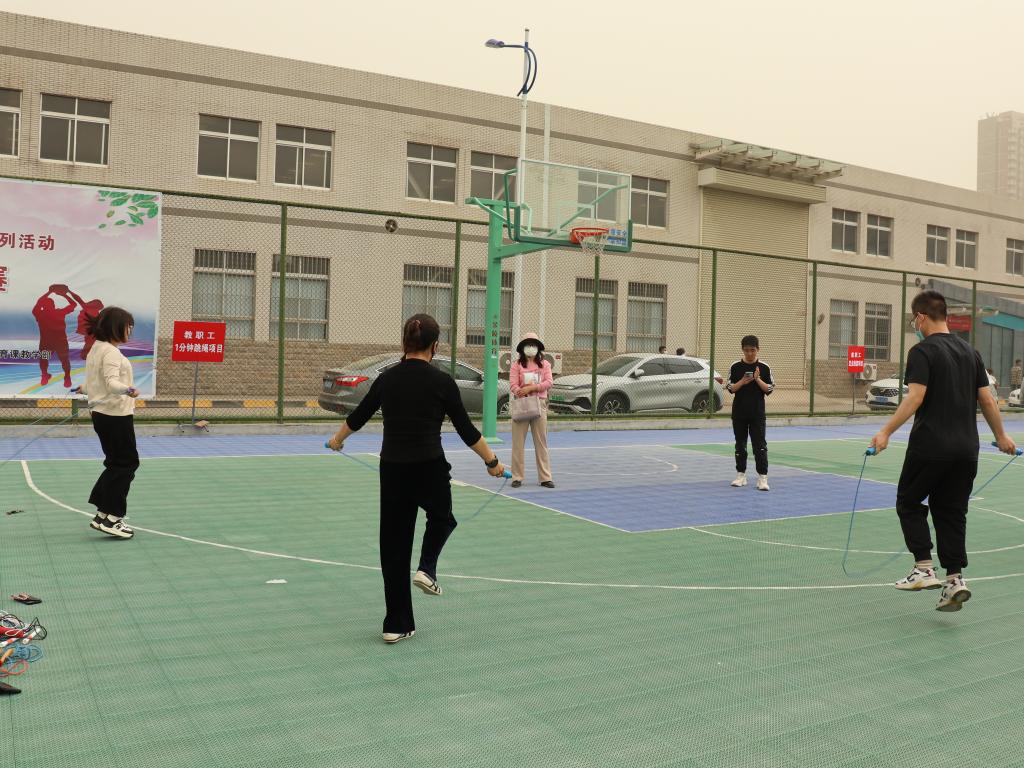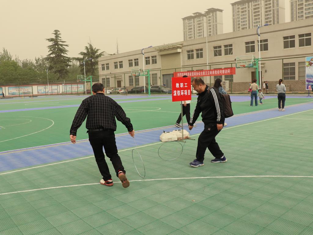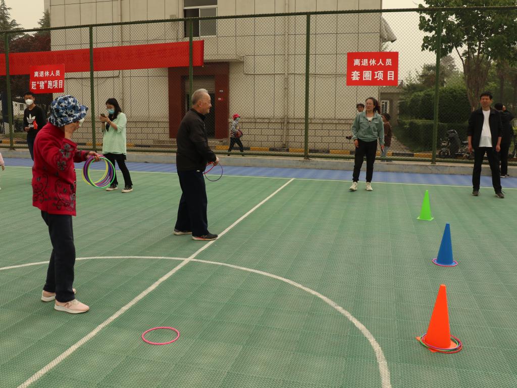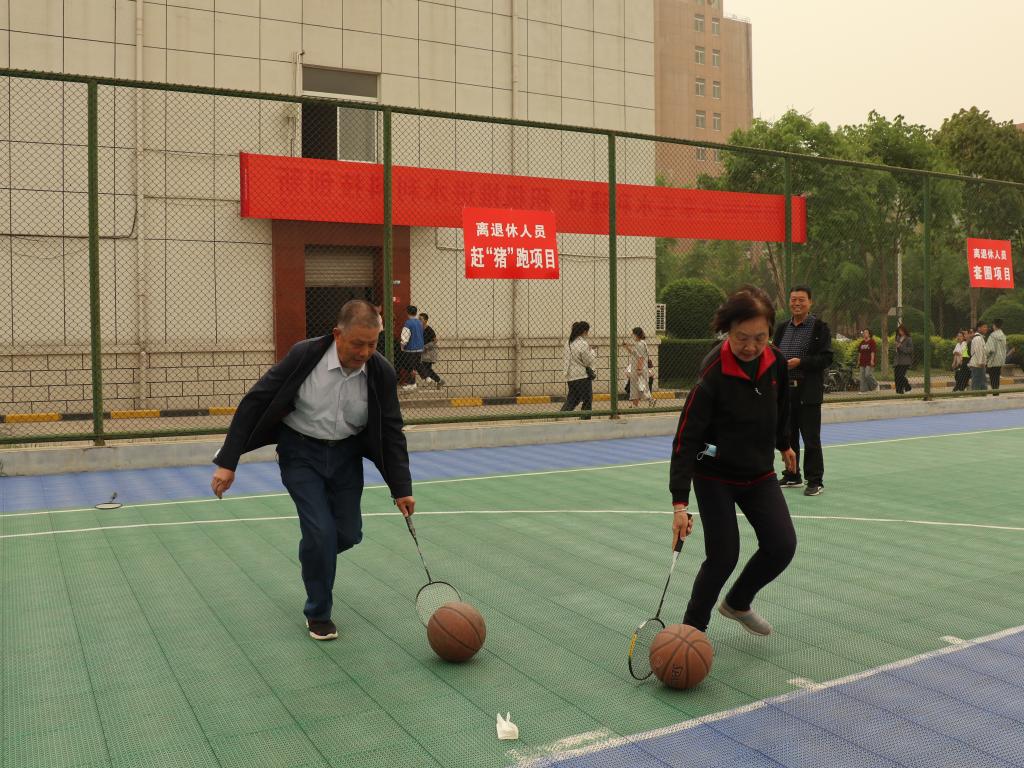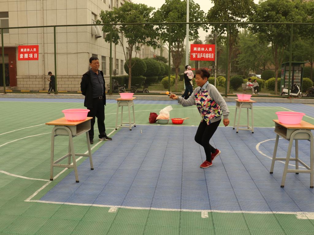 趣味项目中,教职工们本着轻竞技、重参与、重安全的原则,在欢声笑语中参与了运动。滚铁环、跳绳让教职工找回了童年的乐趣,定点投篮、套圈让教职工在稳、准动作中体验了中奖的快乐,赶“猪”跑和“筷”运乒乓球让离退休职工体验了赶“猪”人和“搬运工”的快乐。