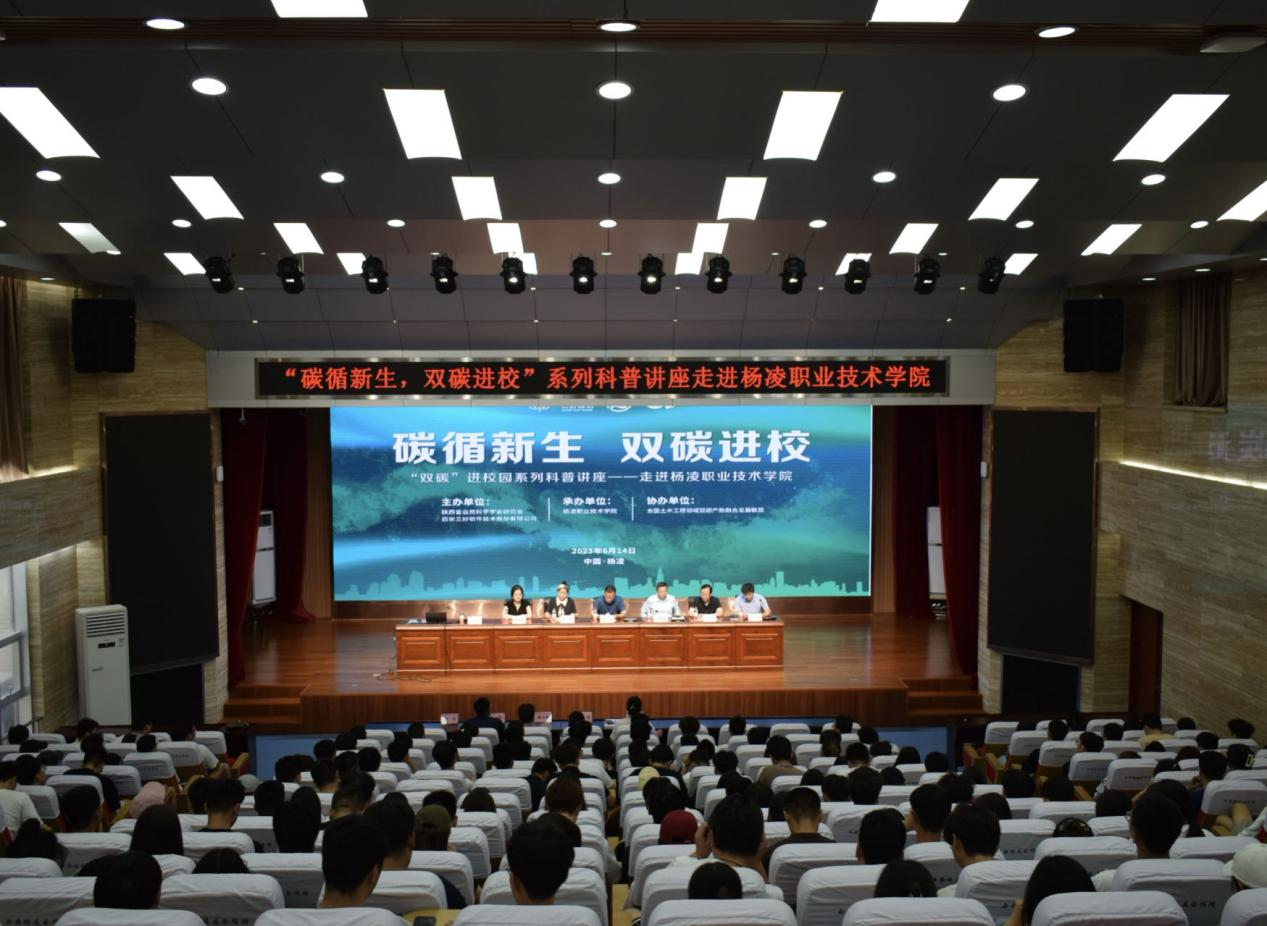 6月14日下午,我院在思辩堂举办陕西省“科技之春——碳循新生、双碳进校”科普讲座。副校长张朝晖,省科学技术协会原一级巡视员、省自然科学学会研究会理事长党广录,西安三好软件技术股份有限公司总经理张倪、校企合作总监兼区域经理张丹、陕西销售经理吴青筱,建筑工程学院负责人及师生代表200余人聆听了讲座。