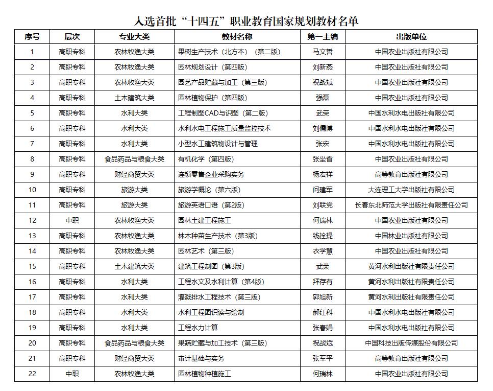 根据《“十四五”职业教育规划教材建设实施方案》和《教育部办公厅关于组织开展“十四五”首批职业教育国家规划教材遴选工作的通知》要求,学校高度重视,组织教材编写团队积极申报,经学校教材建设委员会评审后择优上报,通过形式审查、专家评审、面向社会公示等程序,共有22本教材入选。