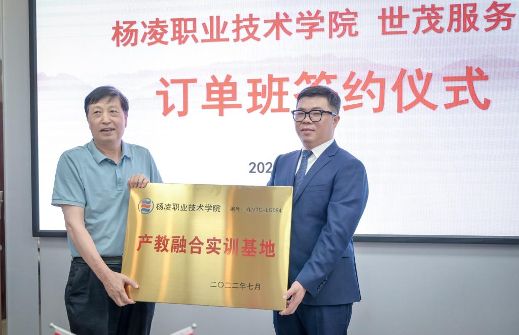 ▲7月28日,伟德官网“世茂服务”订单班签约仪式举行。副校长祝战斌与世茂服务西北中心城市公司总经理周兵代表校企双方签订了订单培养协议,并向企业授予“产教融合实训基地”牌子;周兵向学校授予“现代物业管理专业人才培养基地”牌子;校企双方互聘兼职老师与岗位技能培训师。