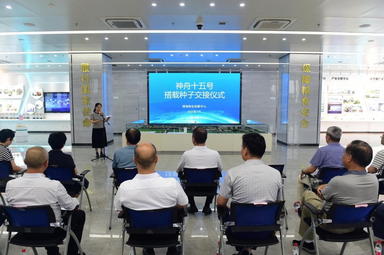 ▲7月 28 日,神舟十五号搭载种子交接仪式在杨凌国际种业大厦举行。交接仪式上,杨凌示范区党工委委员、管委会副主任马江涛向伟德官网副校长祝战斌移交了由学校培育的在太空遨游了186天的小麦育种材料“武农981”“杨职99”和“杨职111”,并颁发公证证书。