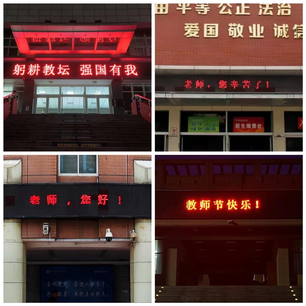 ---开展“为教师亮灯”活动。9月10日,校内各处LED屏滚动播放“老师,您辛苦了!”“教师节快乐”等祝福语,为教师“亮灯”,大力弘扬尊师重教的社会风尚,着力营造庆祝教师节的浓厚氛围。