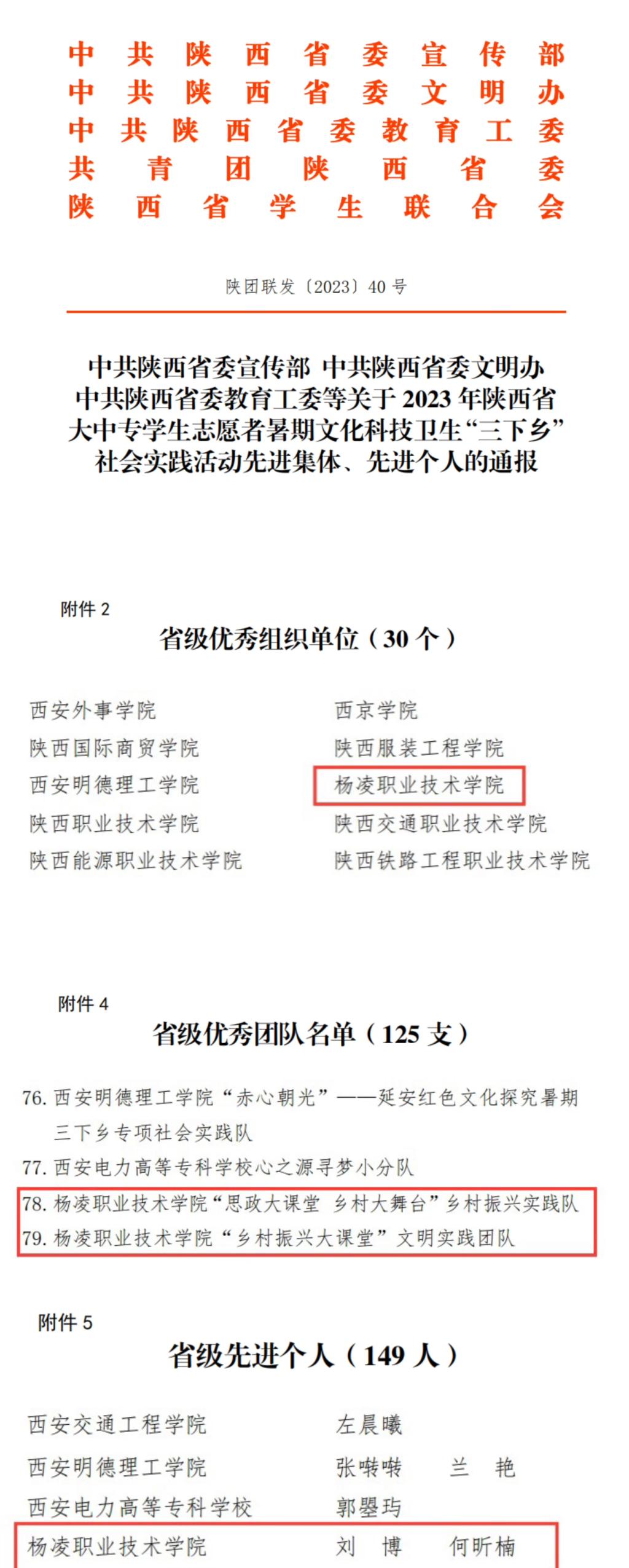 近日,省委宣传部、省委文明办、省委教育工委、共青团省委和省学生联合会对2023年陕西省大中专学生志愿者暑期文化科技卫生“三下乡”社会实践活动先进集体、先进个人予以表扬通报。伟德官网教师刘博、何昕楠荣获省级先进个人,生态环境工程学院“思政大课堂 乡村大舞台”乡村振兴实践队、生物工程学院“乡村振兴大课堂”文明实践团队荣获省级优秀团队,学校荣获省级优秀组织单位。
