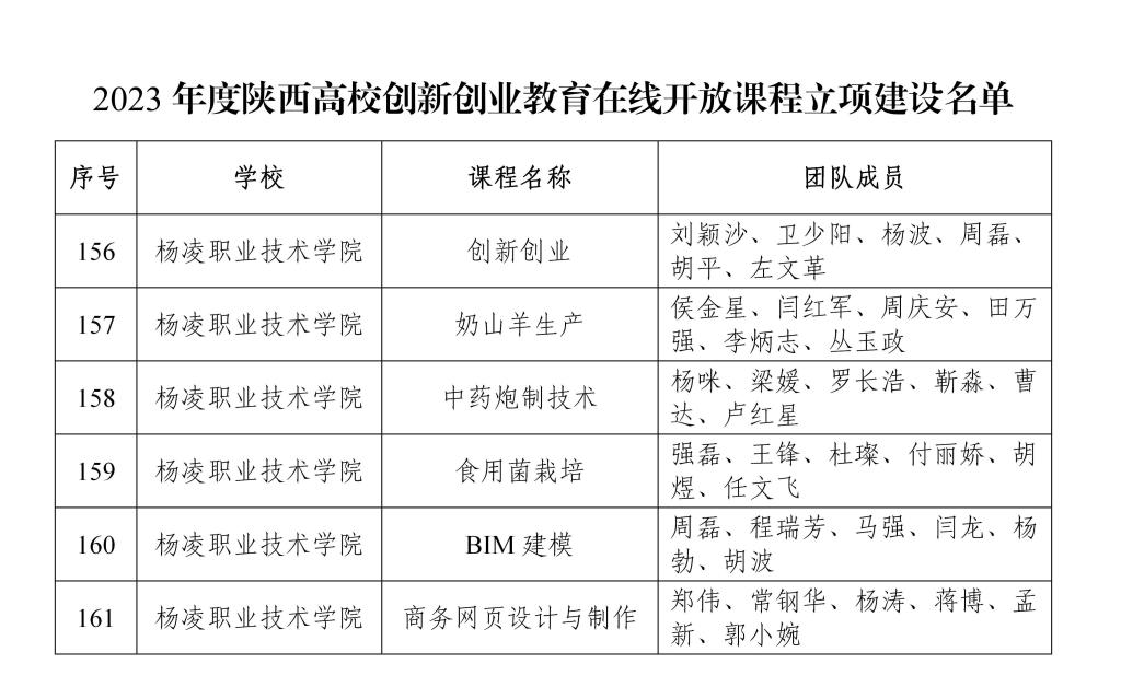 近日,陕西省教育厅公布了2023年陕西高校创新创业教育在线开放课程立项名单,伟德官网创新创业学院刘颖沙主持的《创新创业》、动物工程学院侯金星主持的《奶山羊生产》、药物与化工学院杨咪主持的《中药炮制技术》、生物工程学院强磊主持的《食用菌栽培》、建筑工程学院周磊主持的《BIM建模》、经济与贸易学院郑伟主持的《商务网页设计与制作》等6门课程获批陕西省高校创新创业教育在线开放课程,立项数量及立项率均居同类院校前列。