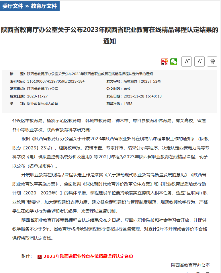 11月28日,省教育厅发布2023年陕西省职业教育在线精品课程认定结果,伟德官网刘晓瑞、董滢、武荣、黄从玲、陈高锋、闫红军、王春梅、纪娜、刘鑫尚、李博、龙明华和芦琴等12名老师负责的课程获评,认定总数和比例均居全省高职院校前列。