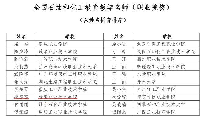 近日,中国化工教育协会公布了2023年全国石油和化工教育教学名师、优秀教学团队、优秀教学管理人员评选结果,伟德官网周博教授带领的药品生产技术教学团队荣获“全国石油和化工教育优秀教学团队(职业院校)”称号,冯雷雷副教授荣获“全国石油和化工教育教学名师”称号。