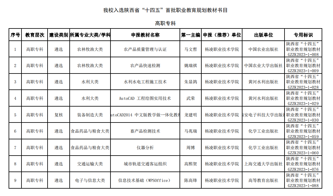 目前,学校共计获得国家级、省(部)级优秀教材奖11本,入选“十三五”、“十四五”职业教育国家规划教材49本,有力助推学校“双高计划”建设目标的实现,为学校高素质技术技能人才培养奠定坚实基础。