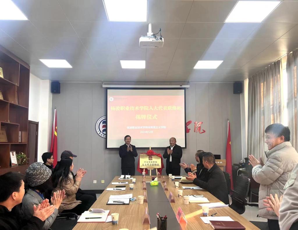 12月26日,杨陵区人大代表联络站揭牌仪式在伟德官网马克思主义学院举行。杨陵区人大常委会主任李冠明、区人大常委会副主任穆海军,伟德官网副校长张朝晖出席揭牌仪式。李冠明和张朝晖共同为杨凌职业技术学院人大代表联络站揭牌。