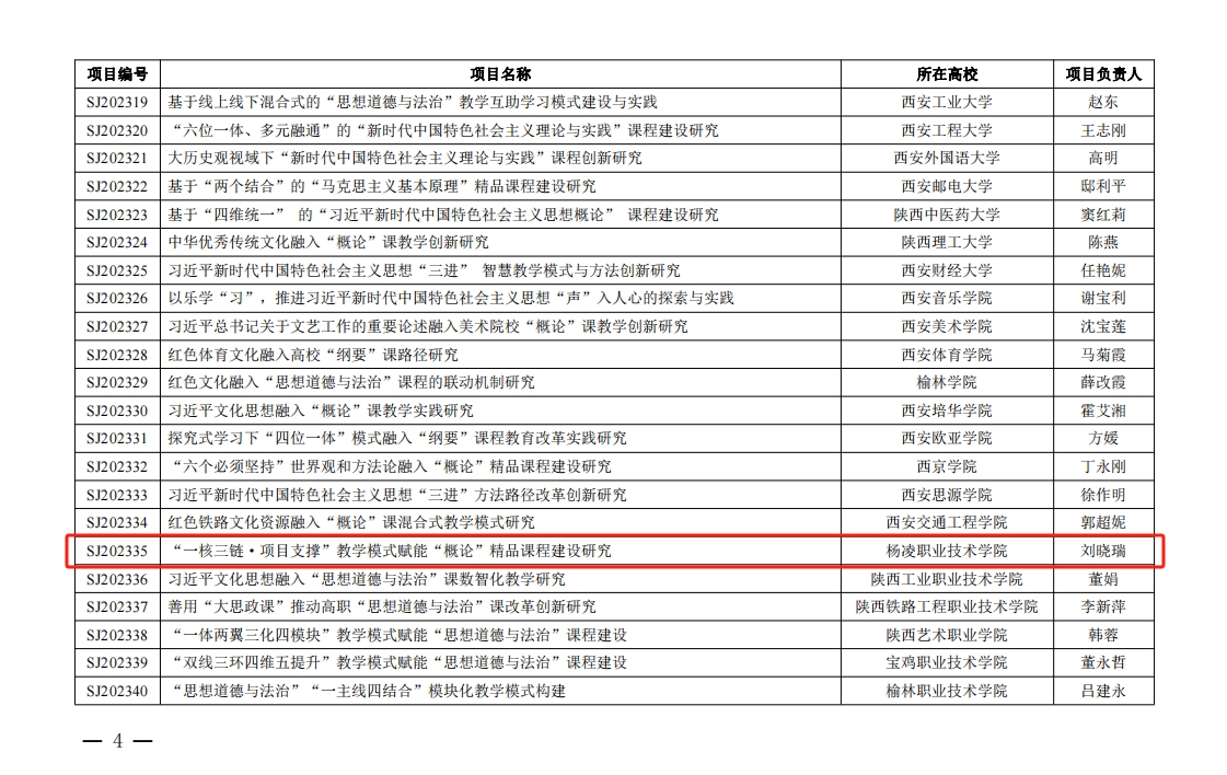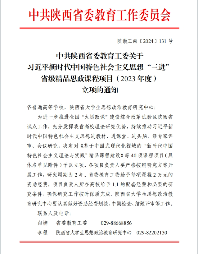 4月3日,陕西省委教育工委公布了2023年度习近平新时代中国特色社会主义思想“三进”省级精品思政课程项目立项名单,伟德官网马克思主义学院刘晓瑞副教授主持的《“一核三链·项目支撑”教学模式赋能“概论”精品课程建设研究》获批立项。