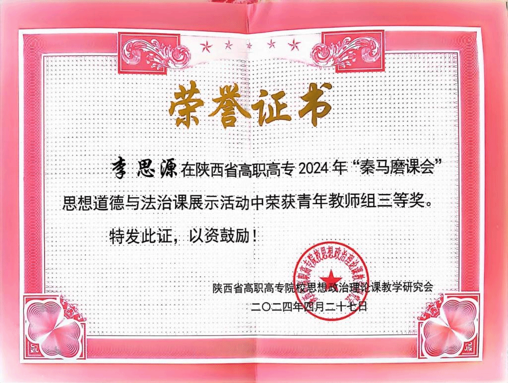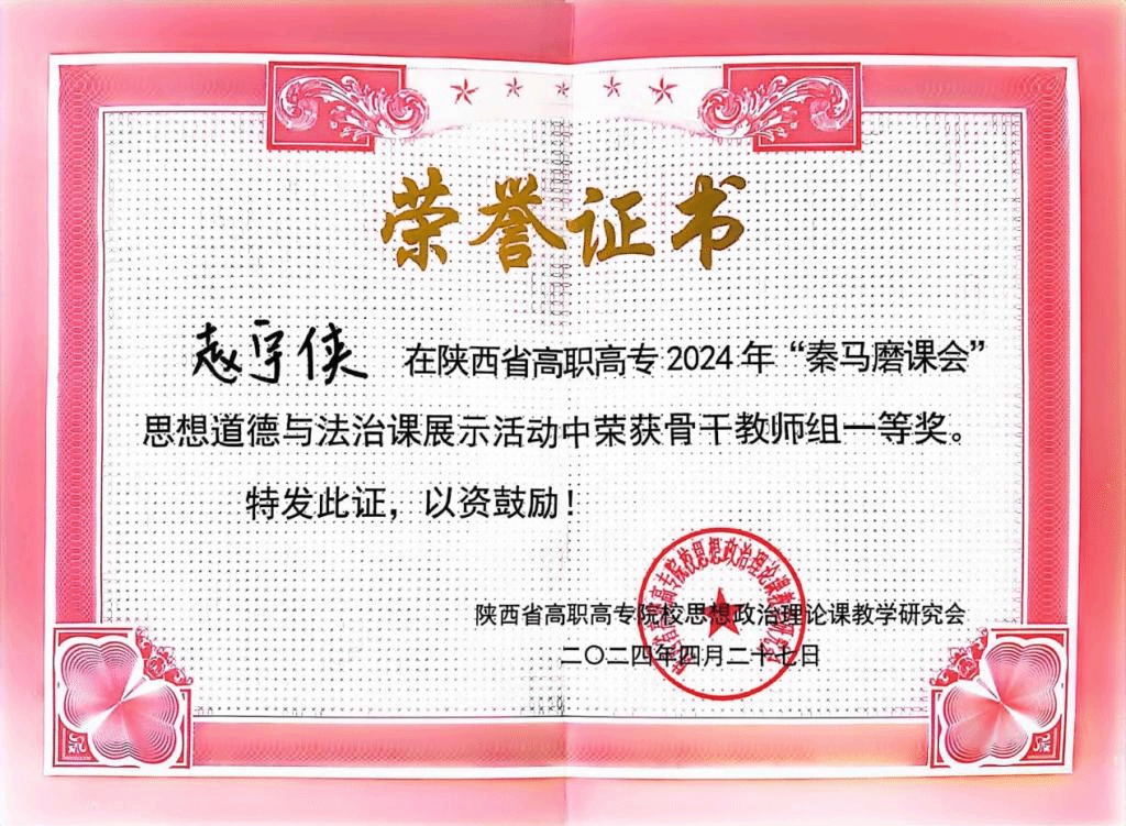 4月27日,伟德官网马克思主义学院教师参加了陕西省高职高专2024年“秦马磨课会”思想道德与法治课程现场展示活动,赵宇侠荣获骨干教师组一等奖,李思源获青年教师组三等奖。