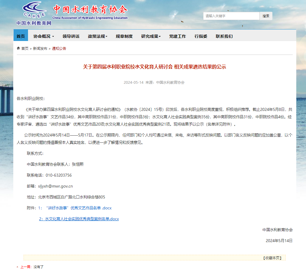 近日,中国水利教育协会公布了第四届水利职业院校水文化育人研讨会相关成果评选结果。由党委宣传部报送的《郑国渠》获“讲好水故事”优秀文艺作品;水利工程学院报送的《以水为基 以师为媒 以文为径——构建水文化思政育人的杨职模式》案例获水文化育人社会实践优秀典型案例。