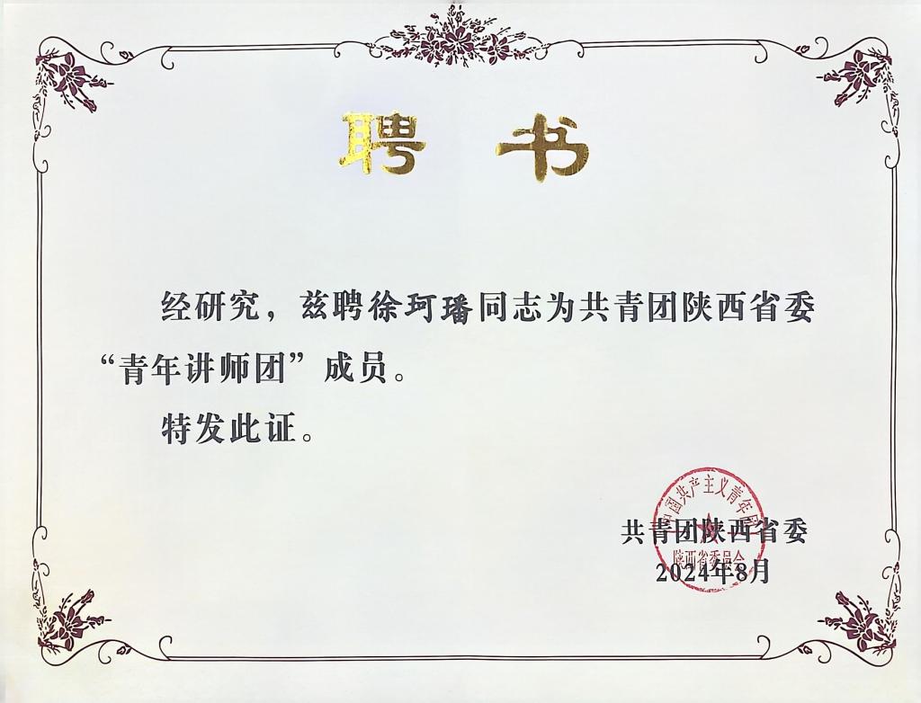 近日,共青团陕西省委公布了团省委“青年讲师团”成员名单,伟德官网马克思主义学院教师徐珂璠受聘共青团陕西省委“青年讲师团”成员。