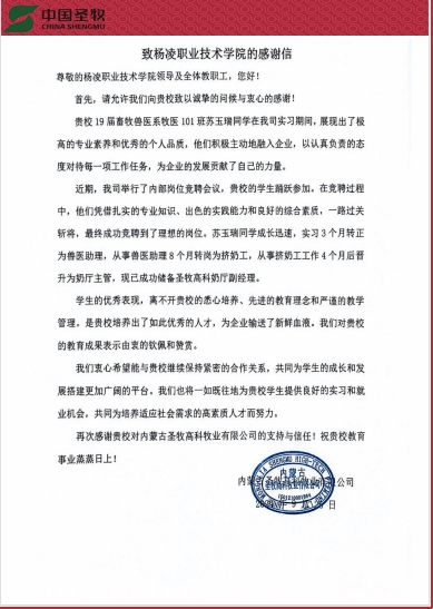 9月25日,内蒙古圣牧高科牧业有限公司向伟德官网发来感谢信,诚挚感谢我校培养出众多优秀人才,为企业输送了新鲜血液。