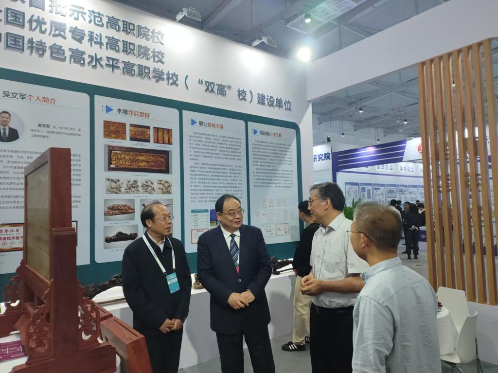 大赛期间,陕西省委教育工委副书记、省教育厅厅长王树声莅临伟德官网展位指导,详细了解“木雕技艺”工艺流程、学生实习实训情况,对伟德官网高技能人才培养工作予以充分肯定。党委书记韩明军、校长仲伟周陪同参观。