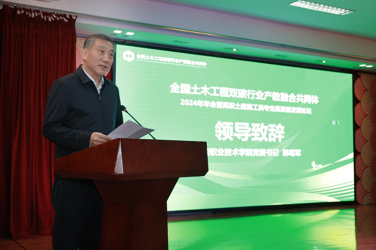 韩明军在致辞中表示,全国土木工程双碳行业产教融合共同体的成立,是面向国家战略需求,深化产教融合,贯彻落实现代职业教育体系建设改革的重要举措和成果体现。他希望依托共同体平台,构建职业教育资源共享平台,推动政行企校多方协同办学,在数字赋能培育高质量科研成果上持续精准发力,在专业与产业对接上不断朝着更高水准迈进,有力推动土木工程双碳行业、土建施工类高等职业教育高质量发展,在绿色建造、数字建造、智能建造领域结出更加丰硕的成果,在加快建筑业绿色低碳转型、推动城乡建设绿色发展、构建现代职业教育体系方面作出新的更大贡献,培育更多质量优良的能工巧匠、大国工匠和高技能人才。