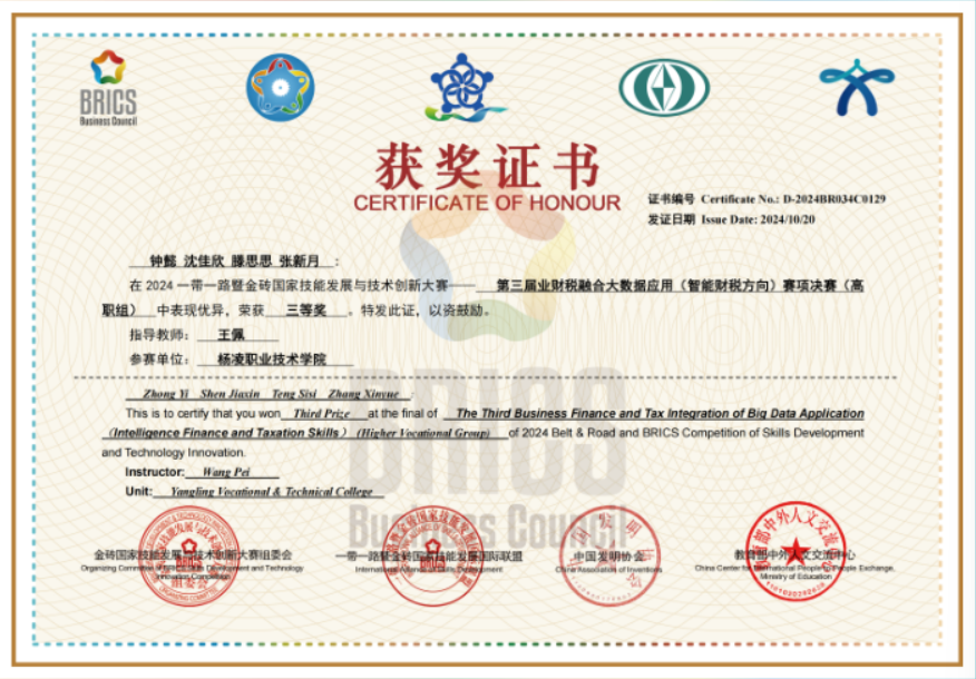 9月20至22日,由金砖国家工商理事会中方理事会与教育部中外人文交流中心联合主办,安徽审计职业学院承办的2024一带一路暨金砖国家技能发展与技术创新大赛——第三届业财税融合大数据应用(智能财税方向)赛项国内决赛落下帷幕。共有来自全国58支高职院校代表队参加,伟德官网经济与贸易学院钟懿、沈佳欣、腾思思、张新月等四名学生获高职组团队赛三等奖。
