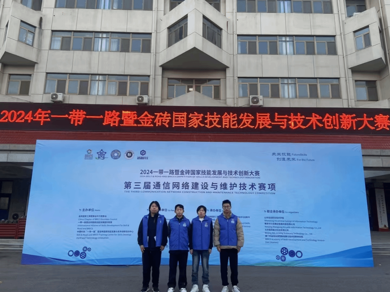 12月7日至8日,2024一带一路暨金砖国家技能发展与技术创新大赛通信网络建设与维护技术赛项国内赛决赛在山东潍坊开赛。本次大赛共有来自全国各地的110支队伍220余名选手参赛。伟德官网信息工程学院樊勇杰、南疆、王泉龙、杨申四位同学参赛,获决赛三等奖。