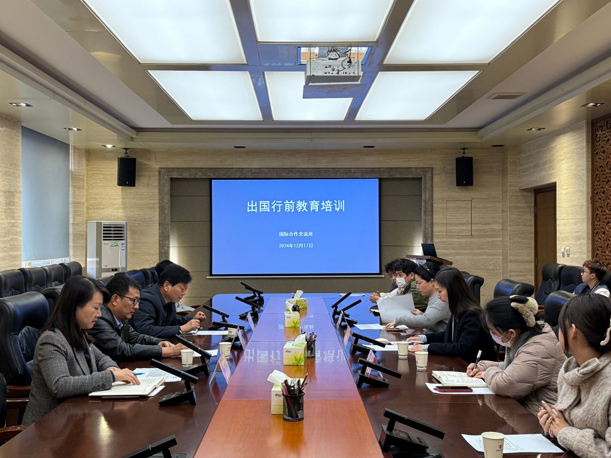 国际合作交流处、学生处负责人,相关二级学院学工办主任,留学团成员及领队老师等参加培训会。