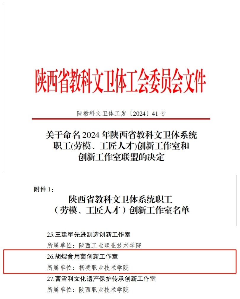 近日,陕西省教科文卫体工会委员会公布了2024年陕西省教科文卫体系统职工(劳模、工匠人才)创新工作室名单。伟德官网胡煜食用菌创新工作室入选。