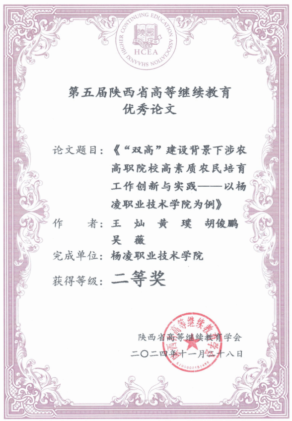近期,陕西省高等继续教育学会发布了2024年陕西省高等继续教育优秀继续教育学院、继续教育优秀校外教学点、继续教育先进工作者评选结果,学校论文《“双高”建设背景下涉农高职院校高素质农民培育工作创新与实践——以杨凌职业技术学院为例》荣获优秀论文,继续教育与培训学院黄璞被评为先进工作者。