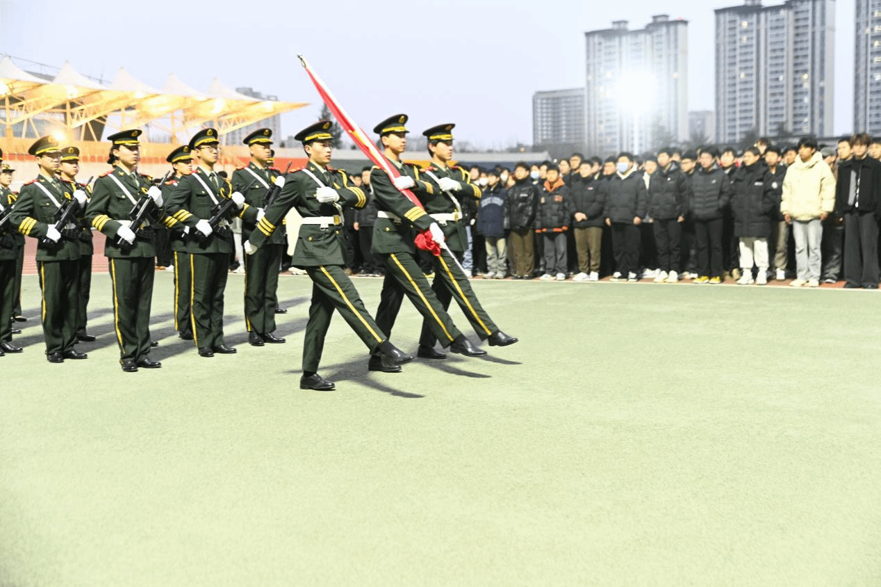 7点整,所有人员集合完毕。国护队员们身着整齐制服,迈着铿锵有力的步伐,缓缓走向升旗台。在激昂的国歌声中,五星红旗冉冉升起,现场师生庄严肃立,向国旗行注目礼。