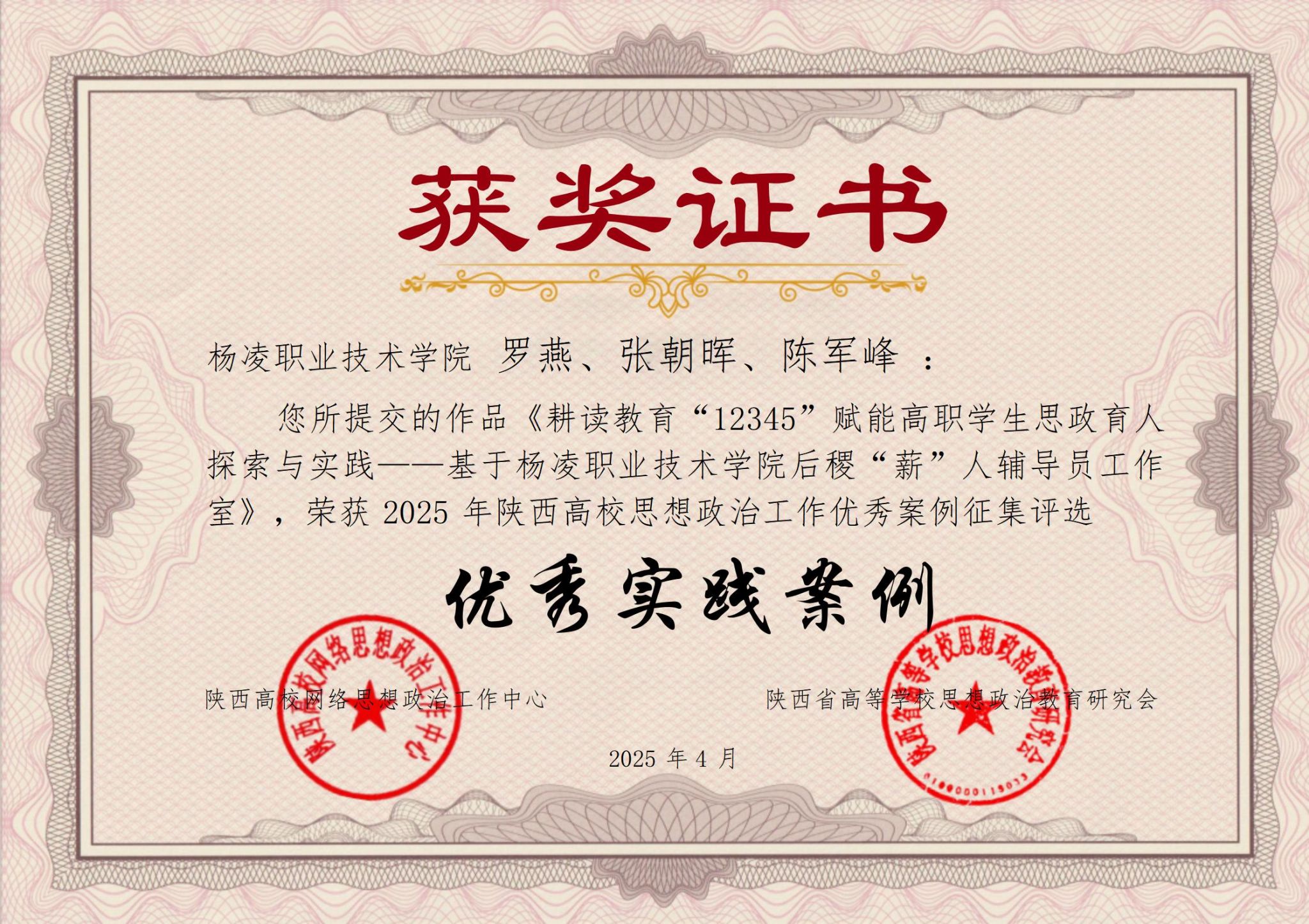 近日,由陕西高校网络思想政治工作中心、陕西省高等学校思想政治教育研究会开展的2025年陕西高校思想政治工作优秀案例征集活动评选结果揭晓。伟德官网报送的案例《耕读教育“12345”赋能高职学生思政育人探索与实践——基于杨凌职业技术学院后稷“薪”人辅导员工作室》入选陕西高校思想政治工作优秀实践案例。