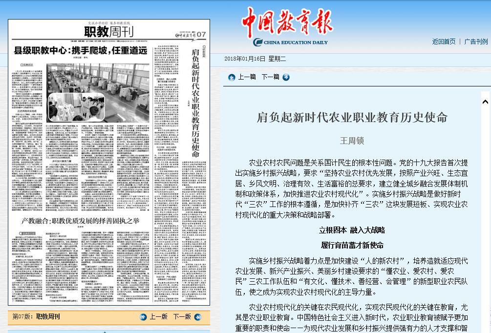 1月16《中国教育报》7版刊发了我院院长王周锁署名文章《肩负起新时代农业职业教育历史使命》全文刊载如下(详情进入)