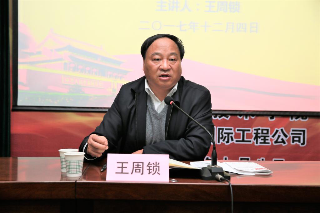 为深入学习宣传贯彻党的十九大精神,进一步统一思想、凝聚共识,切实增强了广大教师立德树人、教书育人的宗旨意识,自觉用习近平新时代中国特色社会主义思想武装头脑、指导实践、推动工作,12月4日下午,学院党委副书记、院长王周锁在水韵楼二楼报告厅,为建筑工程分院和药物与化工分院全体教职工讲党的十九大精神专题党课。