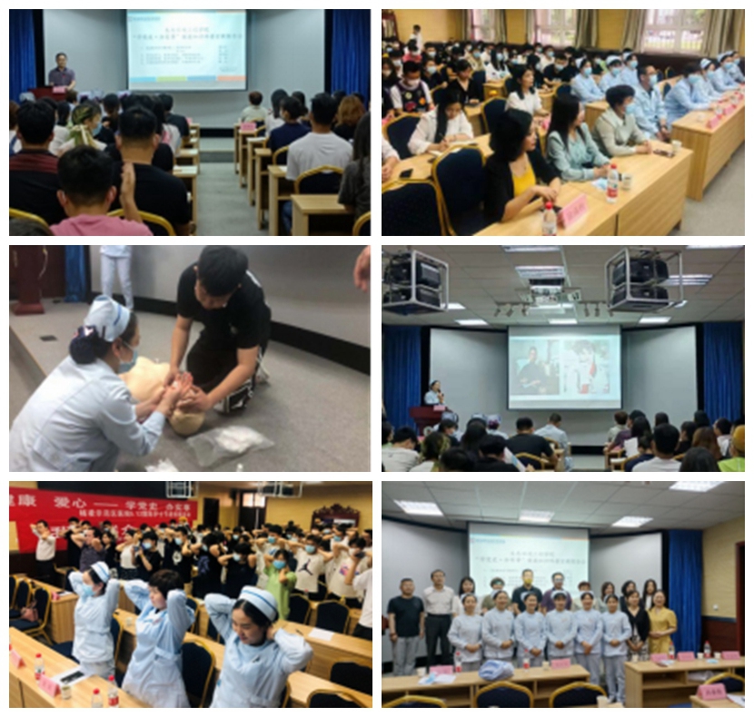 报告会分为四个部分进行。示范区医院急诊科主任裴凡卜、护士长张田作《急救知识与操作》报告,为师生详细地介绍了心脏复苏的基本常识,组织师生代表现场演示了心脏复苏的操作技巧。抗疫英雄、感控科副主任黄伟鸽作了《万众齐心,疫情有我》的报告,她介绍了新型冠状病毒传播路径、目前的抗疫现状、疫情期间如何做好个人防护等,现场演示了七步洗手法。呼吸科护士长闫静作了《预防结核,爱护你我他》的报告,她向师生介绍了结核病的基本概况、预防治疗的相关知识、校园结核病的现状以及校园结核病的应急处理办法等。 疼痛科护士长魏芸作了《颈椎病的预防和保健》主题讲座,她为大家介绍了人类颈椎病的发病现状、临床症状、治疗办法和预防措施。现场教授了颈椎保健操,为大家直观地展示了预防颈椎病的办法,深受大家的欢迎。