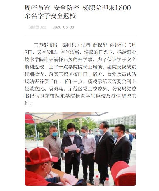 三秦都市报—秦闻讯(记者 薛保华 孙建恒)5月8日,天空放晴,空气清新,温暖的日光下,杨凌职业技术学院迎来满怀已久的开学季。为了保证学子安全顺利返校,上午十点学院院长王周锁、副院长祝战斌详细检查、落实三校区校门口、宿舍、食堂及高铁站接站等各项工作。下午三点,杨凌示范区管委会副主任董立民、袁鸿马,示范区党工委委员、公安局党委书记马卫东带队来学院检查学生返校及疫情防控工作。