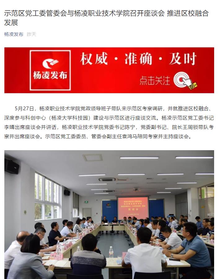 5月27日,杨凌职业技术学院党政领导班子带队来示范区考察调研,并就推进区校融合、深度参与科创中心(杨凌大学科技园)建设与示范区进行座谈交流。杨凌示范区党工委书记李婧出席座谈会并讲话,杨凌职业技术学院党委书记陈宁,党委副书记、院长王周锁带队考察并出席座谈会。示范区党工委委员、管委会副主任袁鸿马陪同考察并主持座谈会。